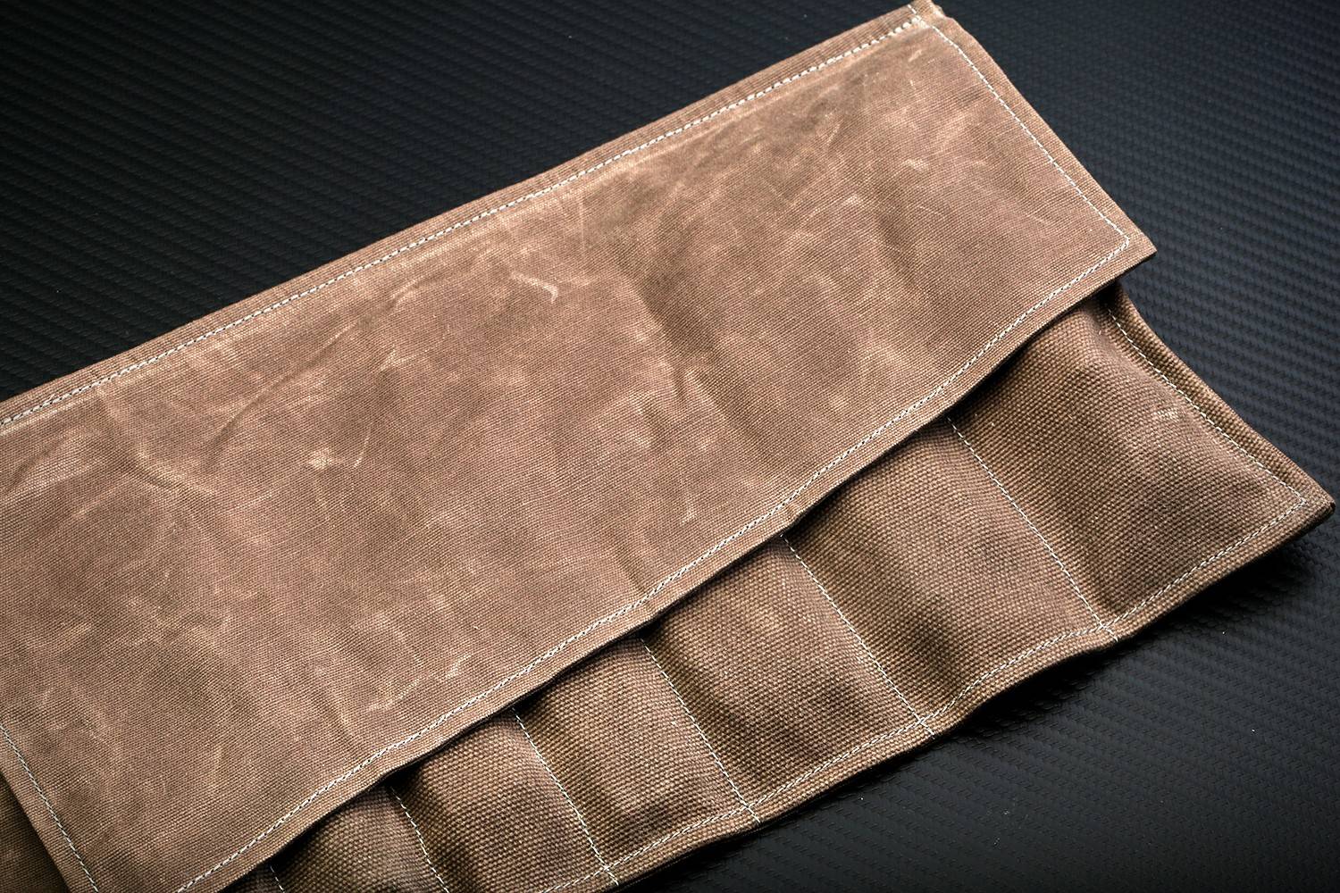 布包收納後可捲成圓柱形,搭配繩索可固定布包。為讓工具收納更完整,以真牛皮繩來達到耐用與長久使用的目的。真牛皮材料也具有不易燃燒的特性